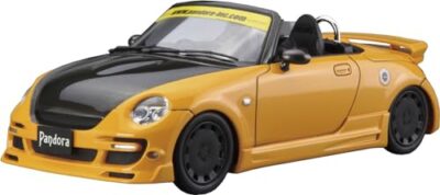 • Aoshima’s newest 1/24-scale model kit of the 2002 Daihatsu Copen features the full aero treatment by Pandora, including a front bumper spoiler, rear bumper spoiler, side step, rear spoiler, and window frame masking stickers.