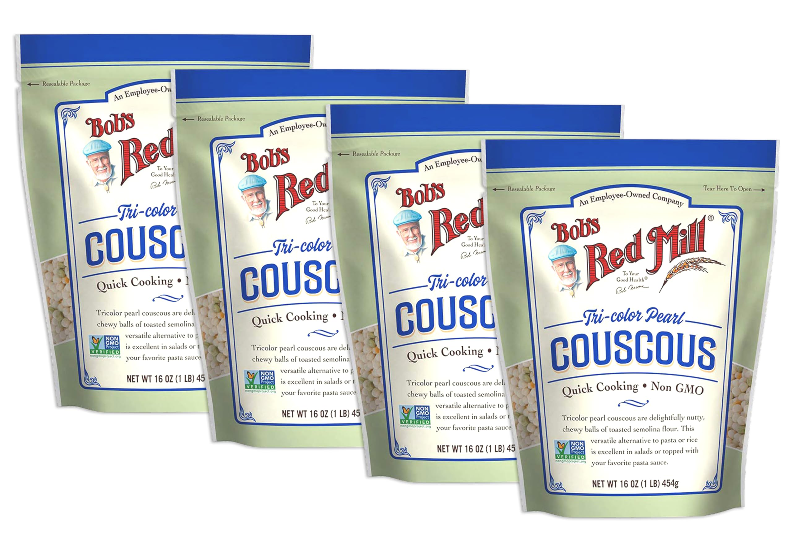 • Case of Four, 16 oz bags (4 lbs total) Vegan; Vegetarian; Kosher Pareve 6g protein per serving Ready to eat in just 10 minutes Alternative to pasta or rice An eye-catching alternative to pasta or rice Pearl couscous has a distinctive nutty flavor Bob’s Red Mill Tri-Color Couscous is a fun way to liven up your meal with color!