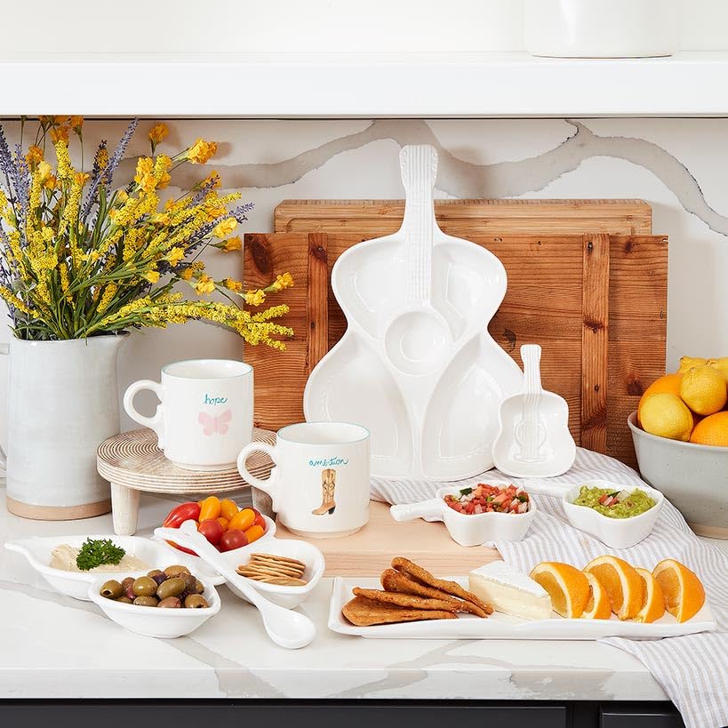 • Versatile pieces: Suitable for both entertaining and everyday use, these tabletop pieces are designed to enhance your dining space with a touch of musical flair. 3-D Guitar Chip and Dip: Made of stoneware, this piece features a 3-D Guitar Chip and Dip design, measuring 15-3/4″W x 10-1/2″D x 1-1/2″H.