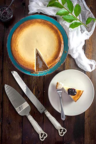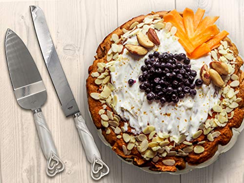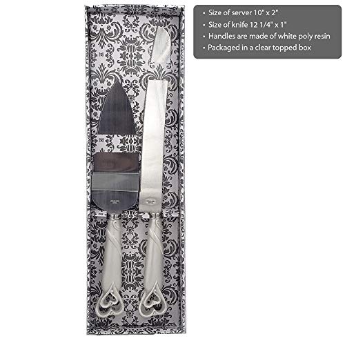 • Wedding Cake Knife and Server Set: The Interlocking Hearts Design cake server set offers 2 pieces – a cake knife and a cake server Silver Cake Knife Set: The cake knife and server set have a white poly resin detailed/carved interlocking hearts design handle supporting a sturdy stainless-steel blade/server Elegant Party Favor: Each set comes delightfully packaged in a clear topped box with a slate gray and white damask design base for storage.