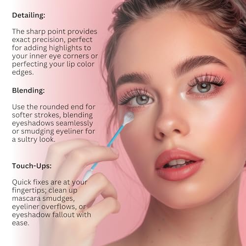 • PRECISION MAKEUP APPLICATOR – soft, double-sided cotton swabs pointed at one end, rounded at the other, for precision application, perfect blending and gentle, effective cleaning.