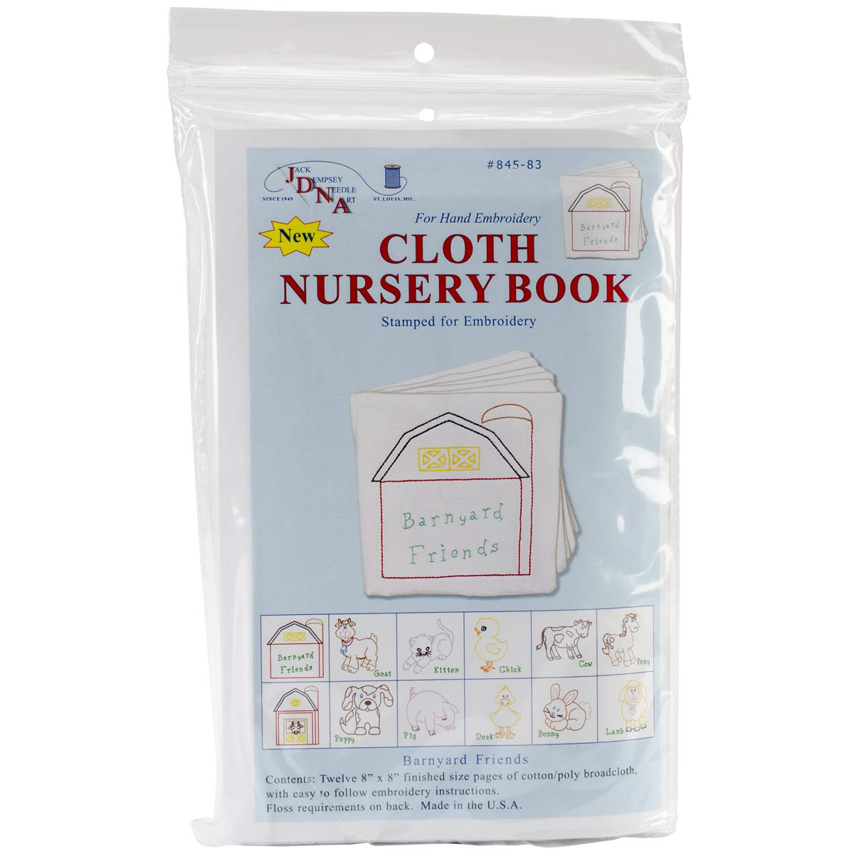 • Approximate finished Size: 8x 8 Includes DMC floss chart and simple to follow stitching instructions Ink washes out Made in the U.S.A Barnyard friends cloth nursery books #84583 from Jack Dempsey Needle Art.