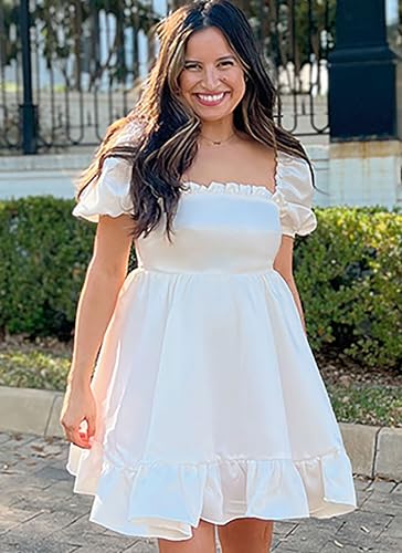 • Baby doll dress with short puff sleeves or wide tie straps has lined bodice, bust darts, built in tulle petticoat to give the skirt volume, center back zipper and ruffle details on the neckline and skirt hem.