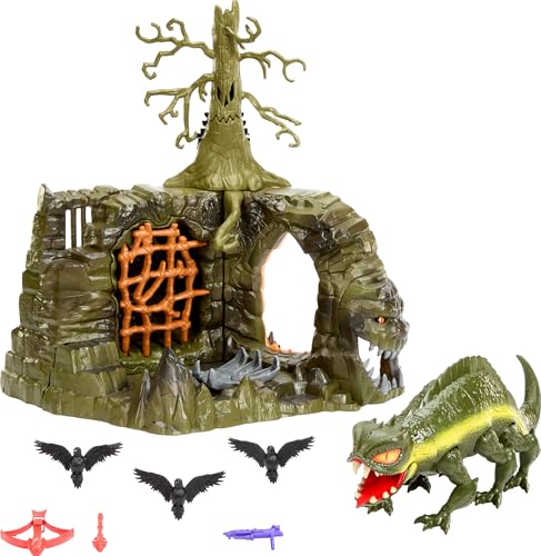 • Scaled for play and display with 5.5-inch MOTU Origins figures Includes one large dragon figure, three birds, and three weapon accessories Features several trap elements, including tube traps and a rock monster trap Prison cell can flip and has multiple locations to hold figures Enter if you dare.
