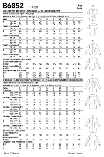 • Women’s sewing pattern packet comes with sewing templates, fabric recommendations, pattern pieces, sizing guides, and instructions for (4) shirts Shirt sewing template for misses’ sizes 8, 10, 12, 14 and 16 Misses’ semi-fitted, button-down shirt features back yoke, collar and sleeve, hem & length variations for greater customization Patterns feature English and French sizing guides Butterick sewing pattern templates are proudly designed and printed in the USA Personalize your wardrobe and make what you wear with Butterick patterns.