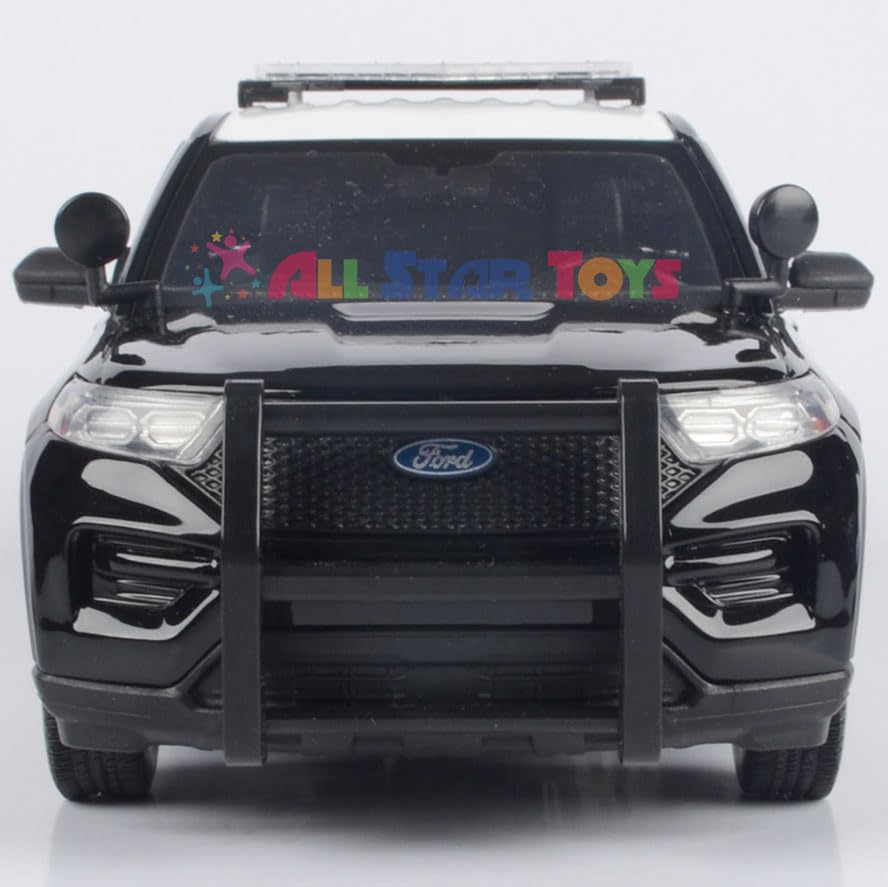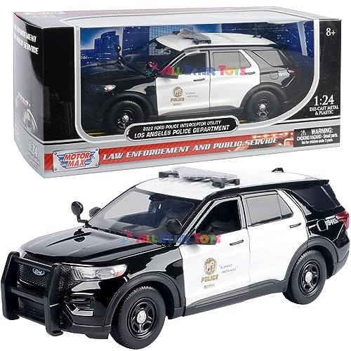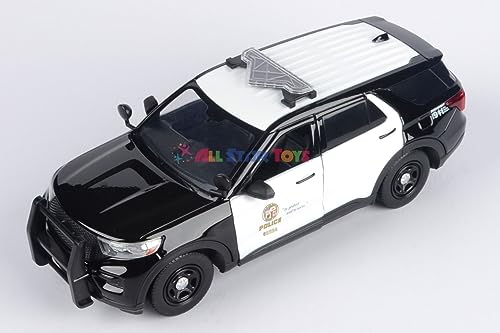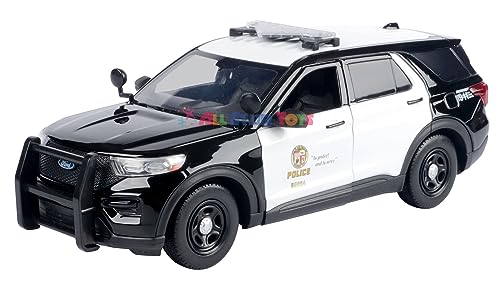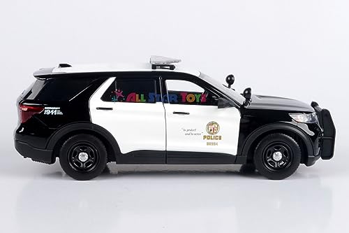 • Official Licensed (Ford and LAPD) 1:24 scale measuring approx 8 x 3 x 2.75 inches Made of diecast metal with plastic parts, rubber tires Openable front doors, detailed interior Pre-assembled Model, not a building kit, not a RC, Not Battery Operated, Lights do not turn on Brand new 1/24 scale diecast car model of 2022 Ford Police Interceptor Black and White from LAPD Los Angeles Police Department.