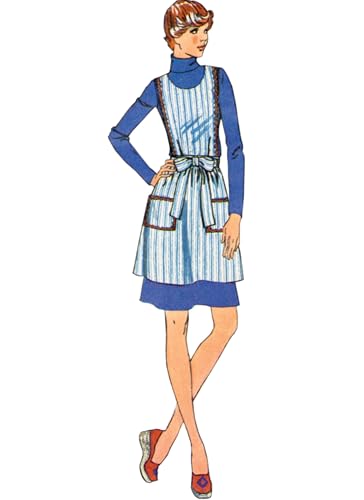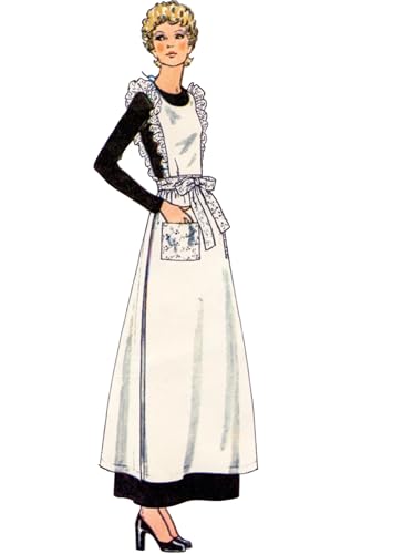 • Simplicity patterns kits come with sewing templates, sizing information, pattern pieces, instructions, and information on how to select fabric and trims with recommendations These aprons sewing patterns can be made to fit misses’ sizes S-M-L The back-wrap and tie apron with skirt gathered to waist band and tie ends has patch pockets and bodice with front pleats, lowered round neckline and back opening fastened with self fabric tie ends; short length apron features jumbo rick-rack trim Above ankle length V.2 with contrasting bodice ruffles has contrasting pockets, waistband, and tie ends; authentic vintage reproduction Fabrics: batiste, canvas, chintz, cotton broadcloth, cotton sateen, dotted Swiss, duck, gingham, lawn, muslin, organdy, ticking, voile; view 1 also in even lengthwise striped fabric; view 2 contrast also in eyelet Vintage Simplicity 1970’s apron in two lengths sewing pattern.