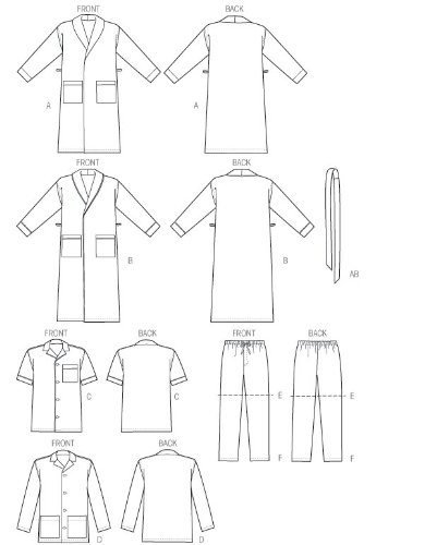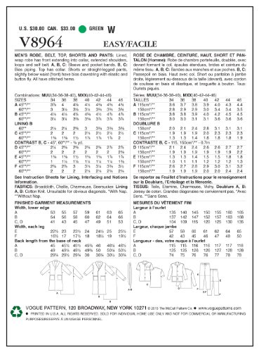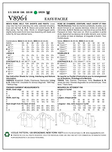 • Sewing Rating: Easy For Rectangle, Hourglass, Triangle and Inverted Triangle Figures; See additional image above for more information Size: MUU (34-36-38-40) Includes pattern pieces and sewing instructions Made in the U.S.A by Vogue Patterns MEN’S ROBE, BELT, TOP, SHORTS AND PANTS: Lined, wrap robe has front extending into collar, extended shoulders, loops and self belt.